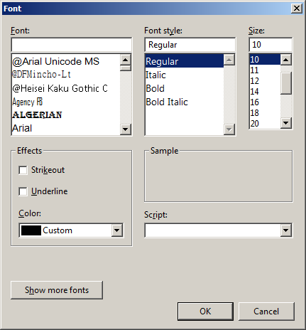 Но вот какая фишка. В диалоге выбора шрифта цвета представлены выпадающим списком с цветными квадратиками и названиями цветов. Но если мой RGB отличается от указанных в списке, то в диалоге он сбивается на какой-нибудь банальный черный. В результате после выбора цвета, диалог возвращает этот сбитый черный цвет шрифта, хотя пользователь даже и не трогал окно выбора шрифта. Ну и со всеми вытекающими — поигрались со шрифтами, а цвет сбился... Посколько пользователь вообще цвет не трогал, он даже и не обращает внимание на эффект сбитого цвета шрифта. Зато видит это сильно, сильно позже — после завершения диалога (матные восклицания оставляю за скобками). Короче, вся юзебальность накрывает ж**ой.